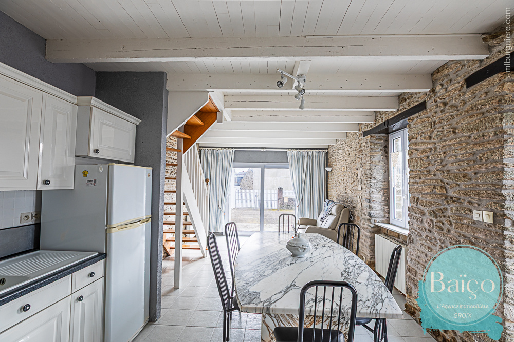 La maison propose une pièce de vie agréable en rez-de-chaussée, ouverte sur l’extérieur grâce à une grande baie vitrée exposée plein ouest, offrant une belle luminosité. La cuisine aménagée et équipée s’intègre harmonieusement à cet espace convivial.