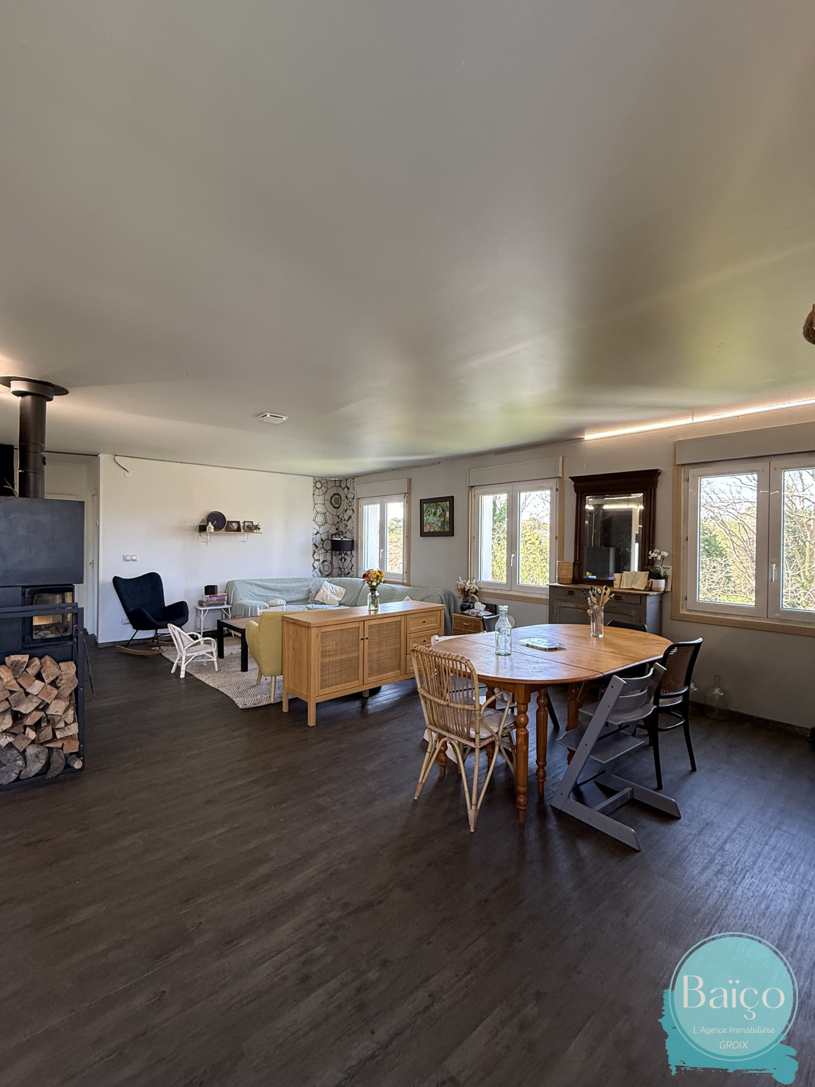 Étage (T4) : vaste espace familial avec séjour traversant, poêle à bois, cuisine ouverte, 2 chambres et bureau. Travaux de rafraîchissement global à prévoir pour révéler son plein potentiel. Accès jardin et atelier indépendant.